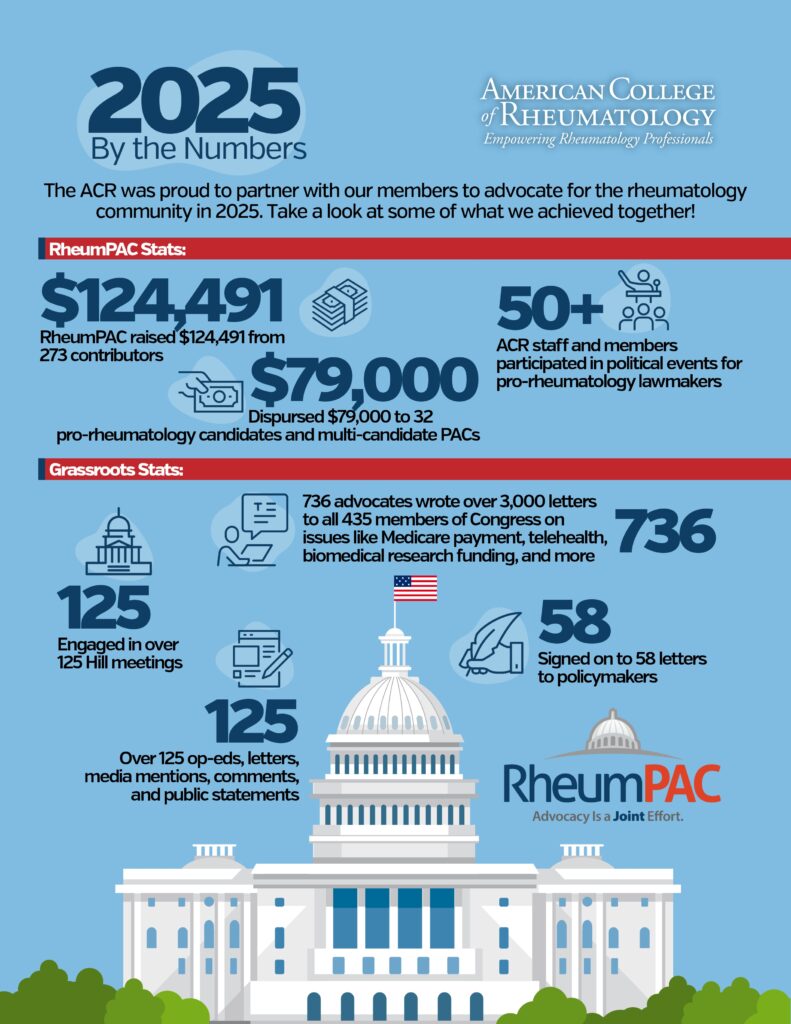 It is the only PAC dedicated to the interests of the rheumatology profession. RheumPAC was created in 2007 with the mission of educating, electing, and supporting federal lawmakers who understand and can positively address the issues that impact rheumatology care providers and their patients.